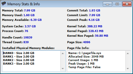 usage, including the installed memory modules ("memory sticks") and page file info. (The current