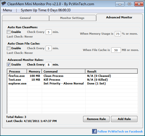 The "Advanced Monitor Rule" gives the user even more control, such as cleaning the memory of a